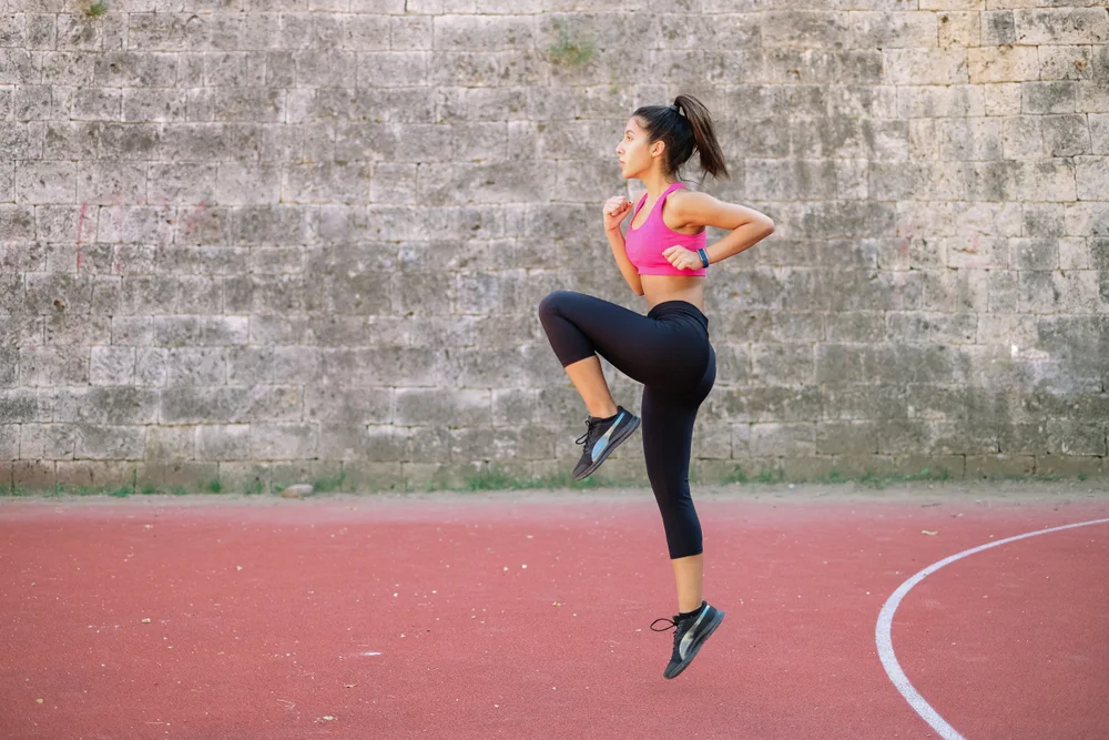 ท่าออกกำลังกาย High Knees ท่ายกเข่าสูง เหมือนกับการวิ่งอยู่กับที่ แต่ต้องยกเข่าให้สูงขึ้นในระดับอก ทำท่านี้สลับซ้ายขวาอย่างรวดเร็ว ช่วยเผาผลาญแคลลอรี่ กระชับต้นขา หน้าท้อง ทำสม่ำเสมอ 30 – 60 วินาที