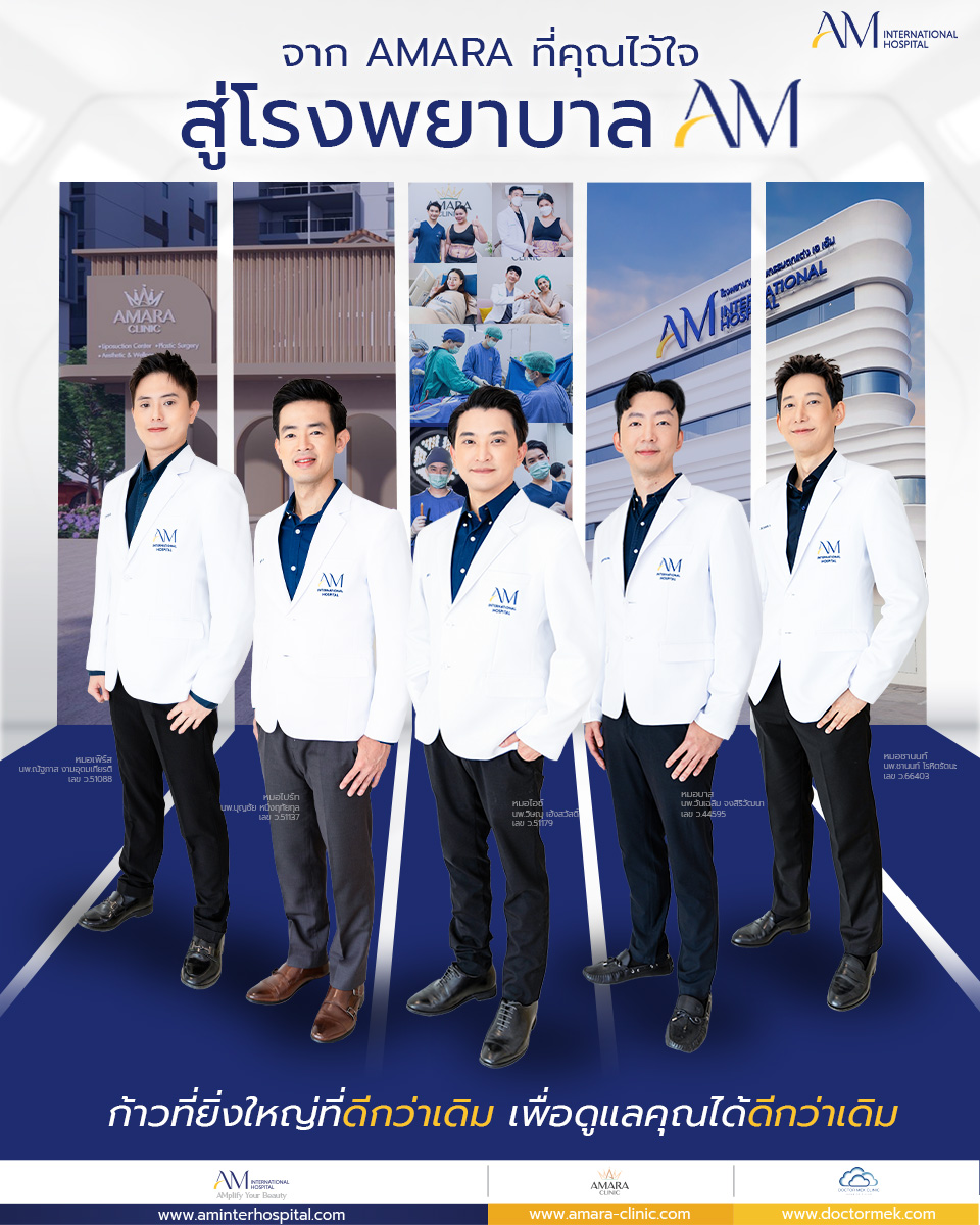 เอเอ็ม อินเตอร์เนชั่นแนล เกิดจากการร่วมมือกันของ 2 คลินิกที่มีความรู้ความชำนาญในสองด้านที่แตกต่างกัน ได้แก่ Amara Clinic ผู้ชำนาญการด้านรูปร่าง และ Dr.Mek Clinic ผู้ชำนาญการด้านผิวพรรณ ด้วยความตั้งใจที่อยากยกระดับมาตรฐานการรักษาและการดูแลเรื่องความงาม ทั้งด้านรูปร่างและผิวพรรณแบบครอบคลุม เพื่อตอบโจทย์ทุกท่าน บริการด้วยใจ