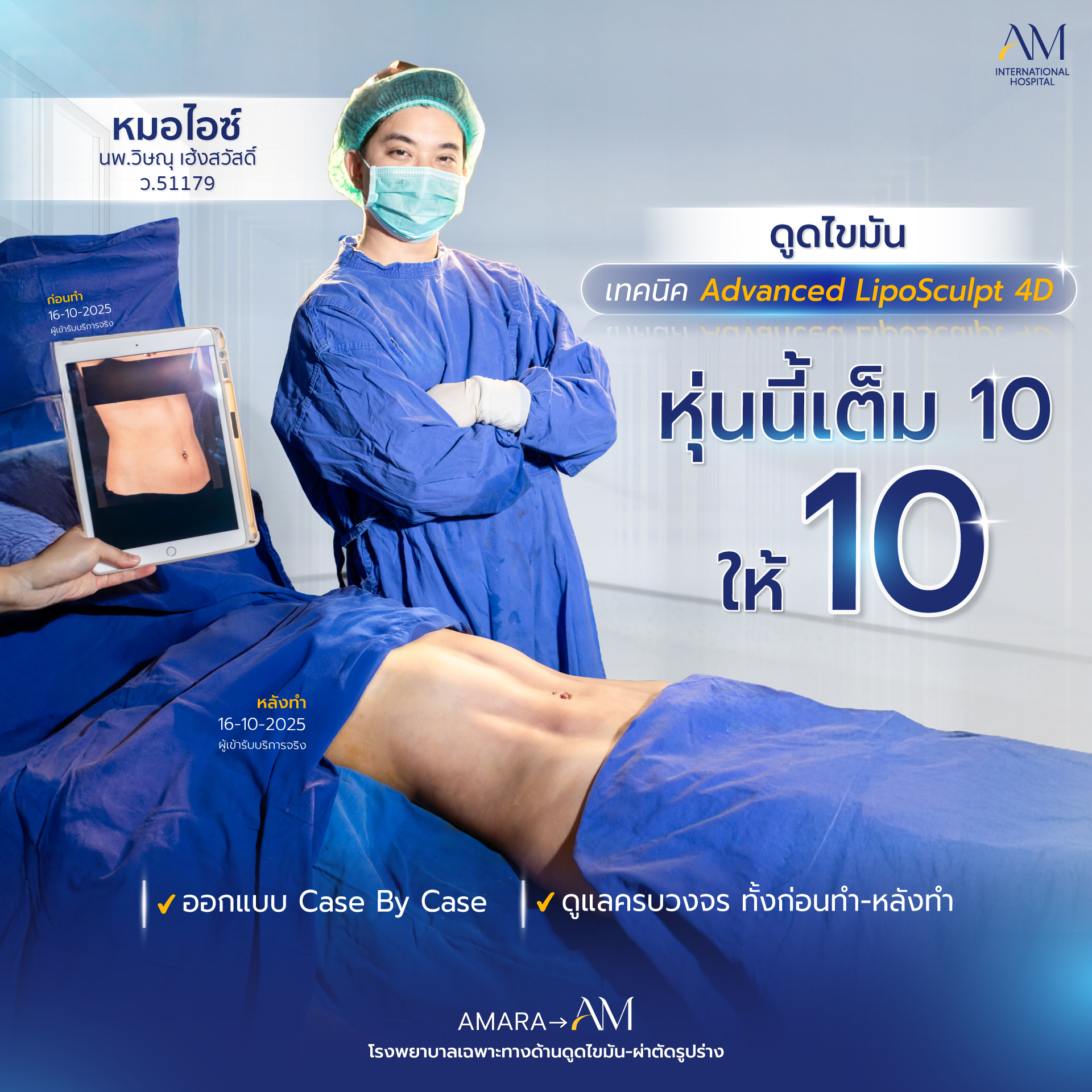ความสำเร็จของการดูดไขมันในแต่ละเคสที่ AM International Hospital ไม่ได้เป็นเพียงผลลัพธ์จากเครื่องมือหรือเทคโนโลยีในการรักษาเพียงเท่านั้น แต่เกิดจากการวางระบบการดูแลแบบองค์รวม โดยมีบุคลากรทางการแพทย์ที่มีความชำนาญและประสบการณ์ในด้านการดูดไขมันเป็นแกนหลัก อย่างคุณหมอไอซ์ (นพ. วิษณุ เฮ้งสวัสดิ์ เลข ว. 51179) แพทย์ผู้ชำนาญการด้านการดูดไขมัน ที่พร้อมรังสรรค์ปั้นหุ่นสวยไม่ได้จำกัดอยู่แค่การดูดไขมันให้บางลงเท่านั้น แต่ยังมุ่งเน้นการปั้นสรีระให้ได้สัดส่วนสวยงามดูเป็นธรรมชาติ